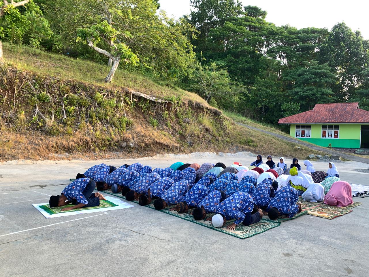 Lapangan Upacara MTsN 7 Maluku Tengah. Kegiatan sholat dhuha dan bimbingan membaca Al-Qur'an oleh guru.
