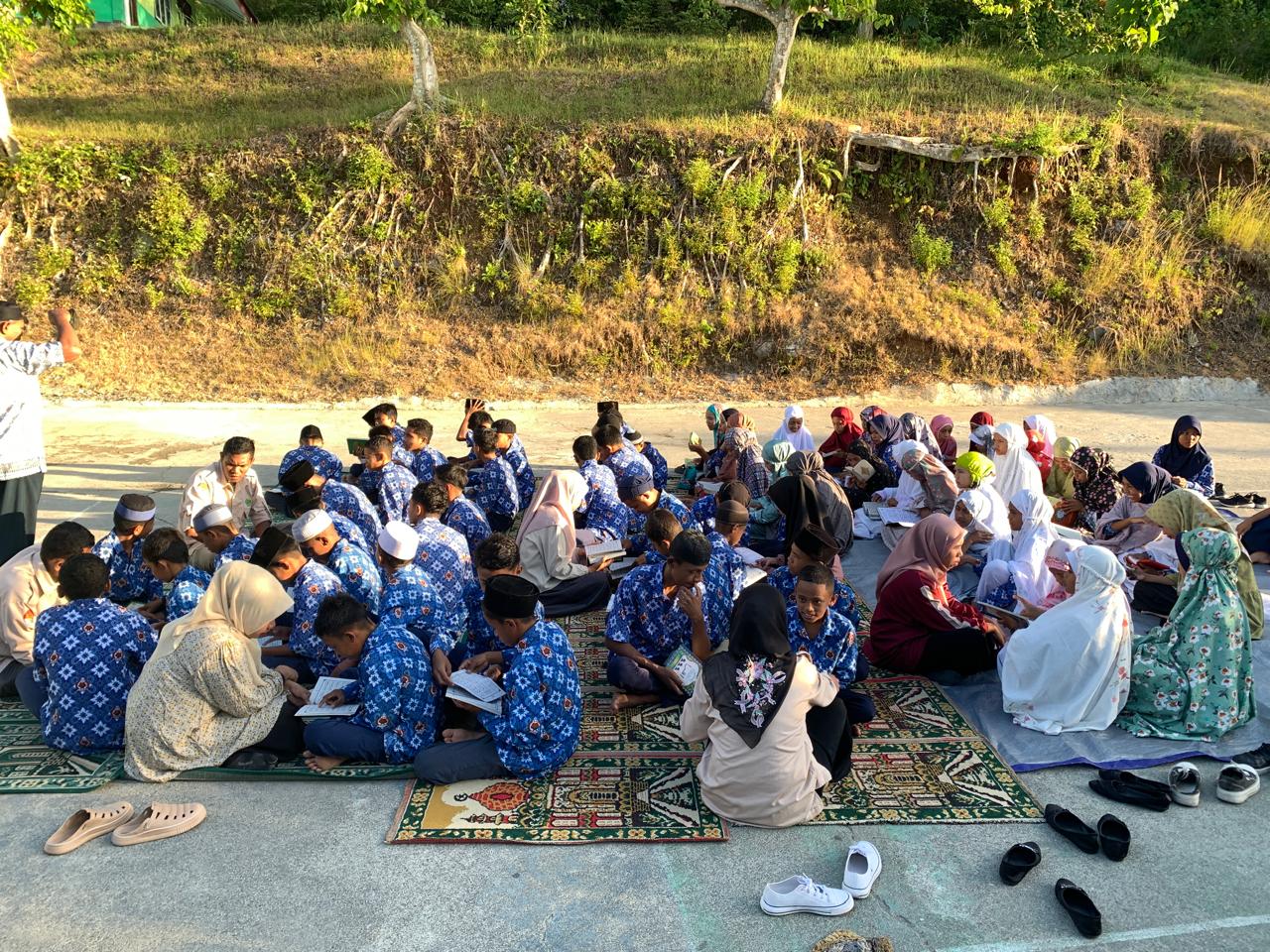 Kamis, 05/02/2026 Sholat duha, Lapangan Upacara Matsajutah. Kegiatan sholat dhuha dan bimbingan membaca Al-Qur'an oleh guru merupakan metode pendidikan karakter berbasis budaya religi (religious culture) yang umum diterapkan di sekolah atau madrasah. Guru membimbing siswa yang belum lancar membaca melalui pendekatan individual, pembelajaran remedial, metode fonik (bunyi huruf), latihan repetitif (drilling), serta penggunaan media visual seperti flashcard dan buku cerita. Bimbingan dilakukan bertahap, fokus pada pengenalan huruf/suku kata, motivasi khusus, dan kolaborasi dengan orang tua untuk pengulangan di rumah.
