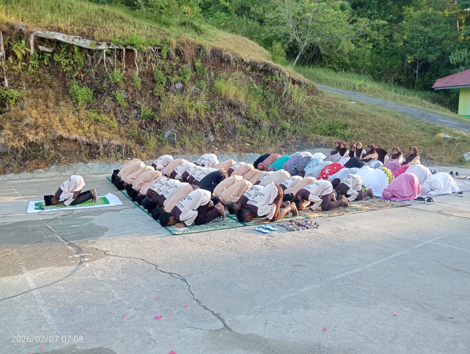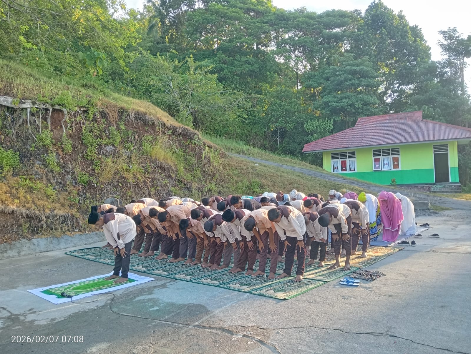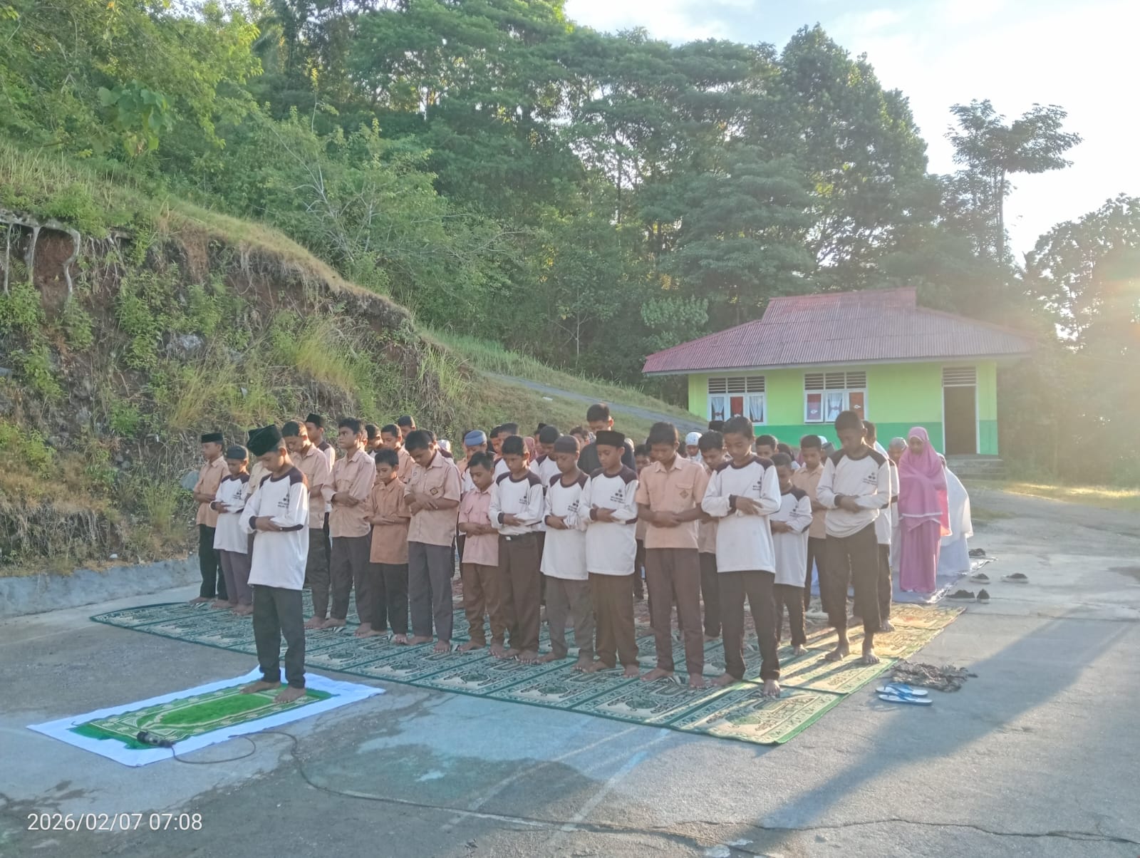 Kamis, 05/02/2026 Sholat duha, Lapangan Upacara Matsajutah. Kegiatan sholat dhuha dan bimbingan membaca Al-Qur'an oleh guru merupakan metode pendidikan karakter berbasis budaya reli