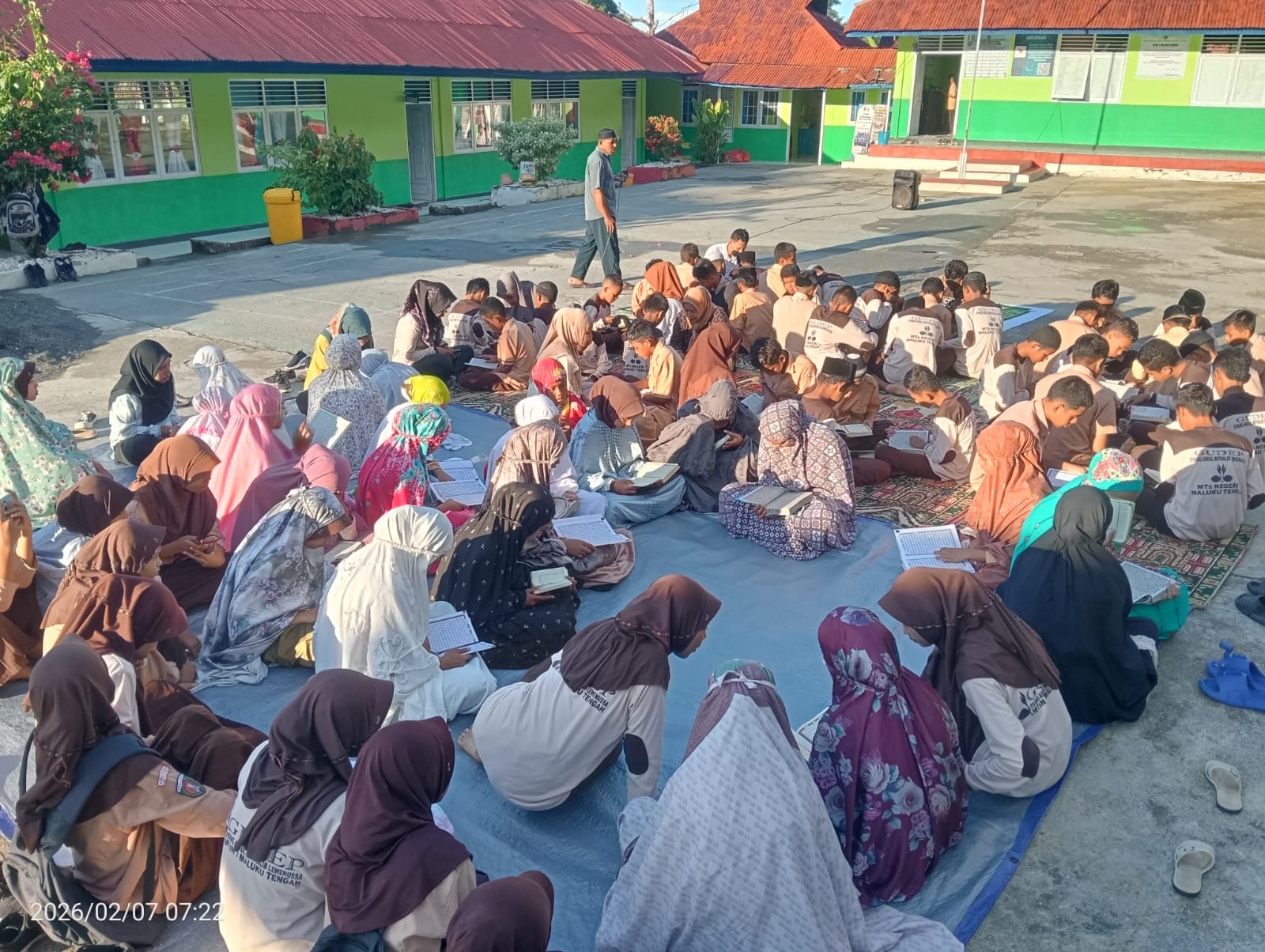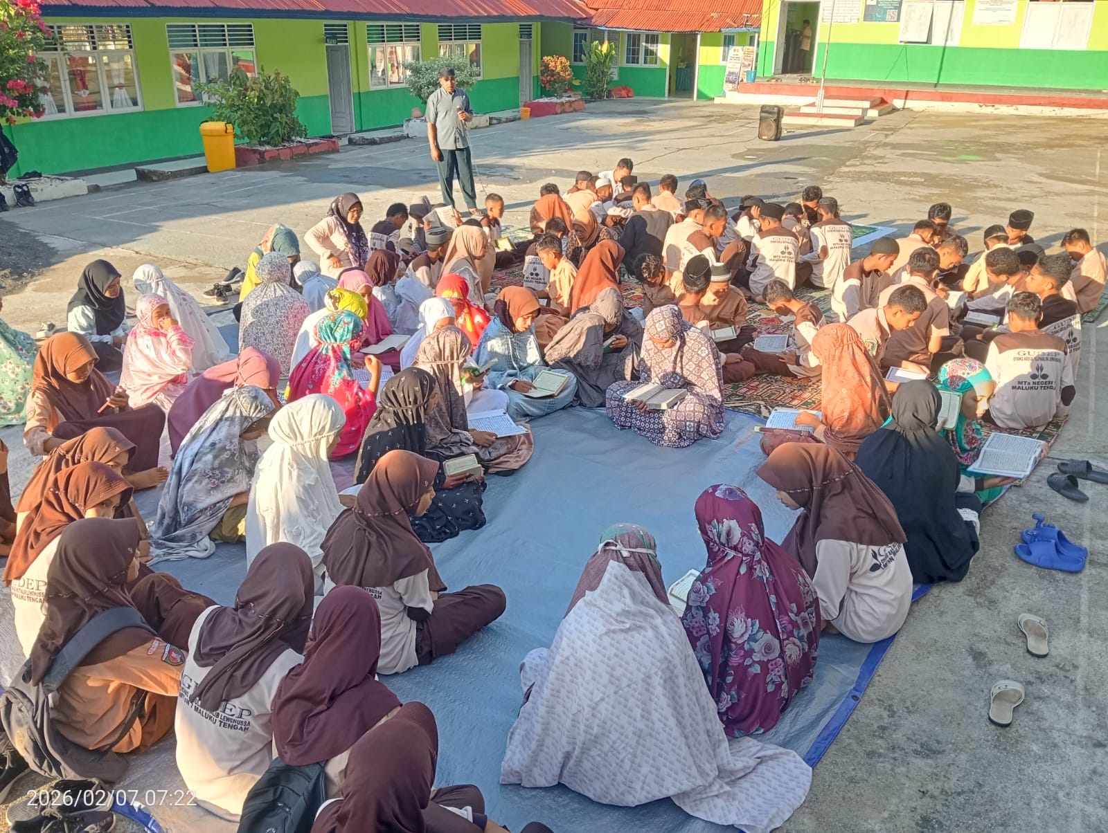 Lapangan Upacara MTsN 7 Maluku Tengah. Kegiatan sholat dhuha dan bimbingan membaca Al-Qur'an oleh guru.